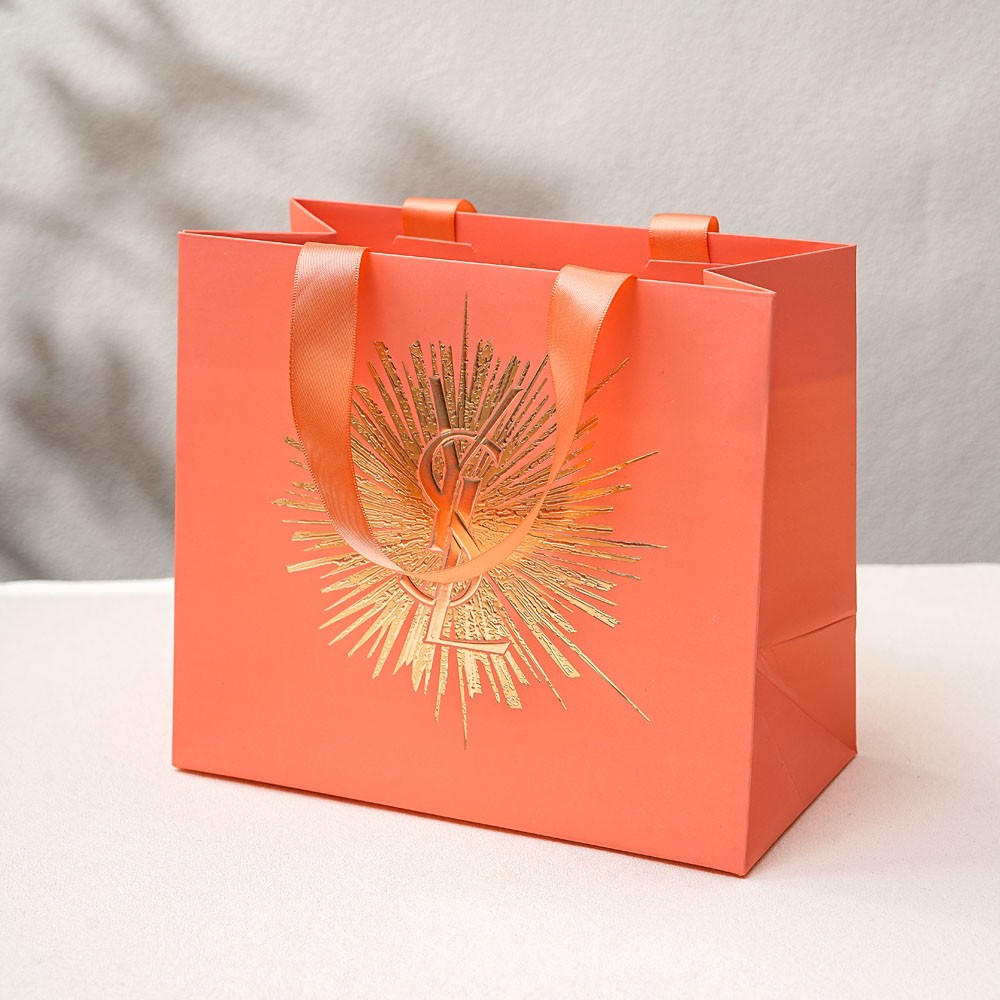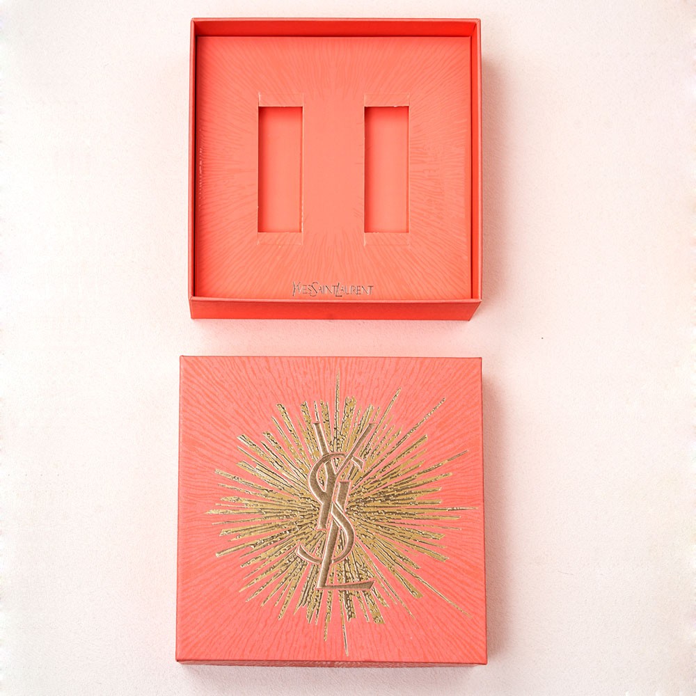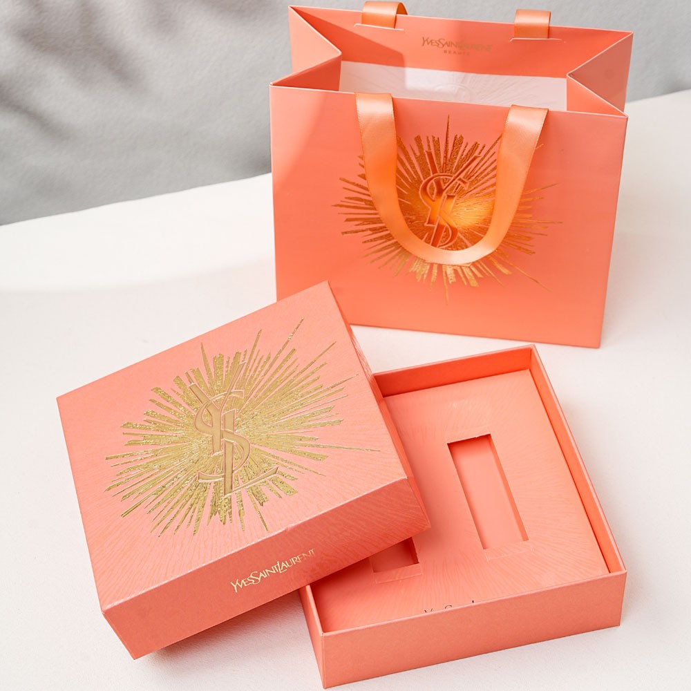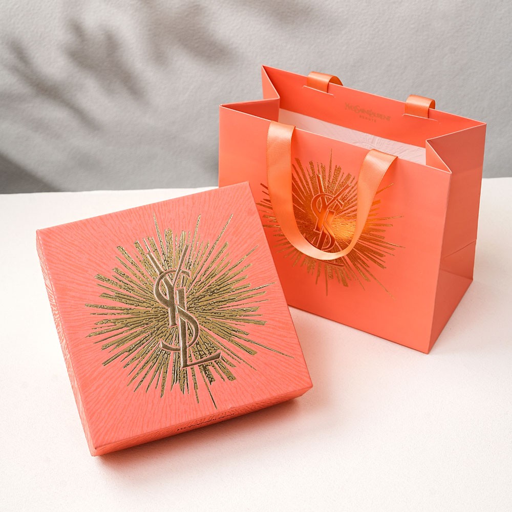 box size 16.5X16.5X5cm, tote bag is 17X19.5X10cm, box and bag matches the same color, shiny gold LOGO